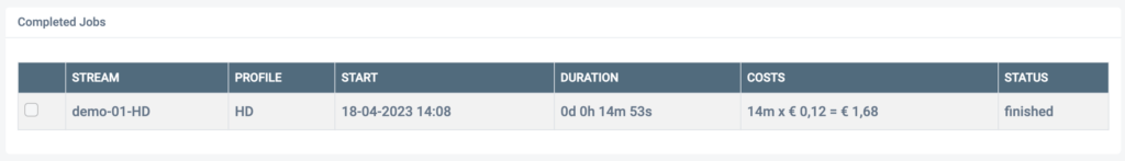 You can view your active streams in the ‘Configured Jobs’ list in the Live Transcoding menu. Old live stream transcoding jobs are shown under the ‘Completed Jobs’.