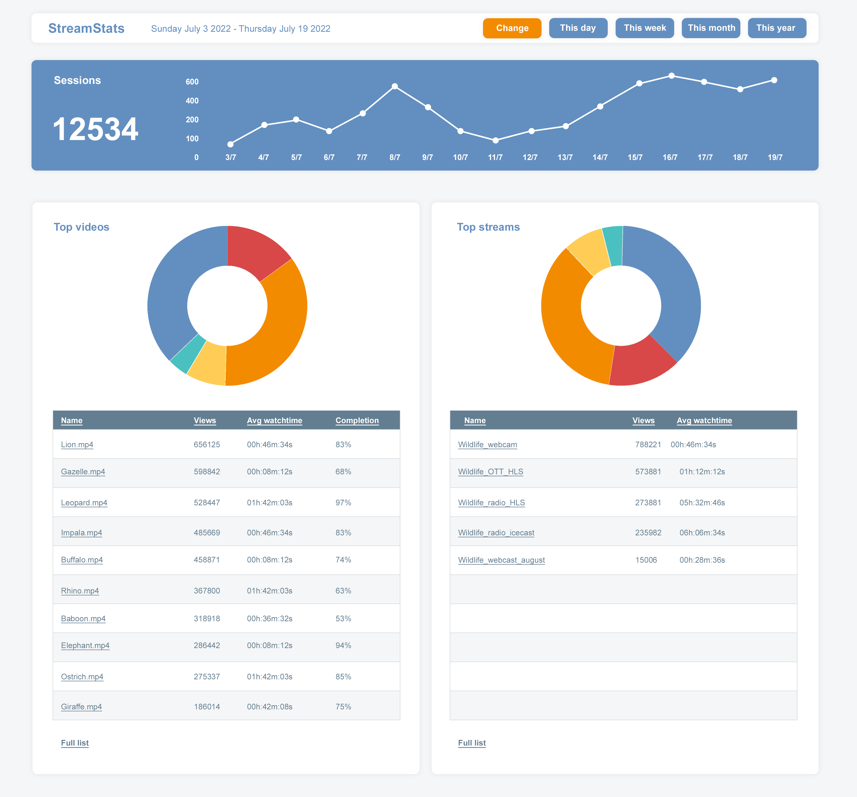 Jet-Stream StreamStats equips you with comprehensive insights into your streaming content on one page. Scrambled IP addresses ensure viewer privacy, while in-depth analytics enable you to gauge viewer engagement effectively, giving real-time insights in stream popularity, session duration, detailed geographies, qualities, errors and devices.