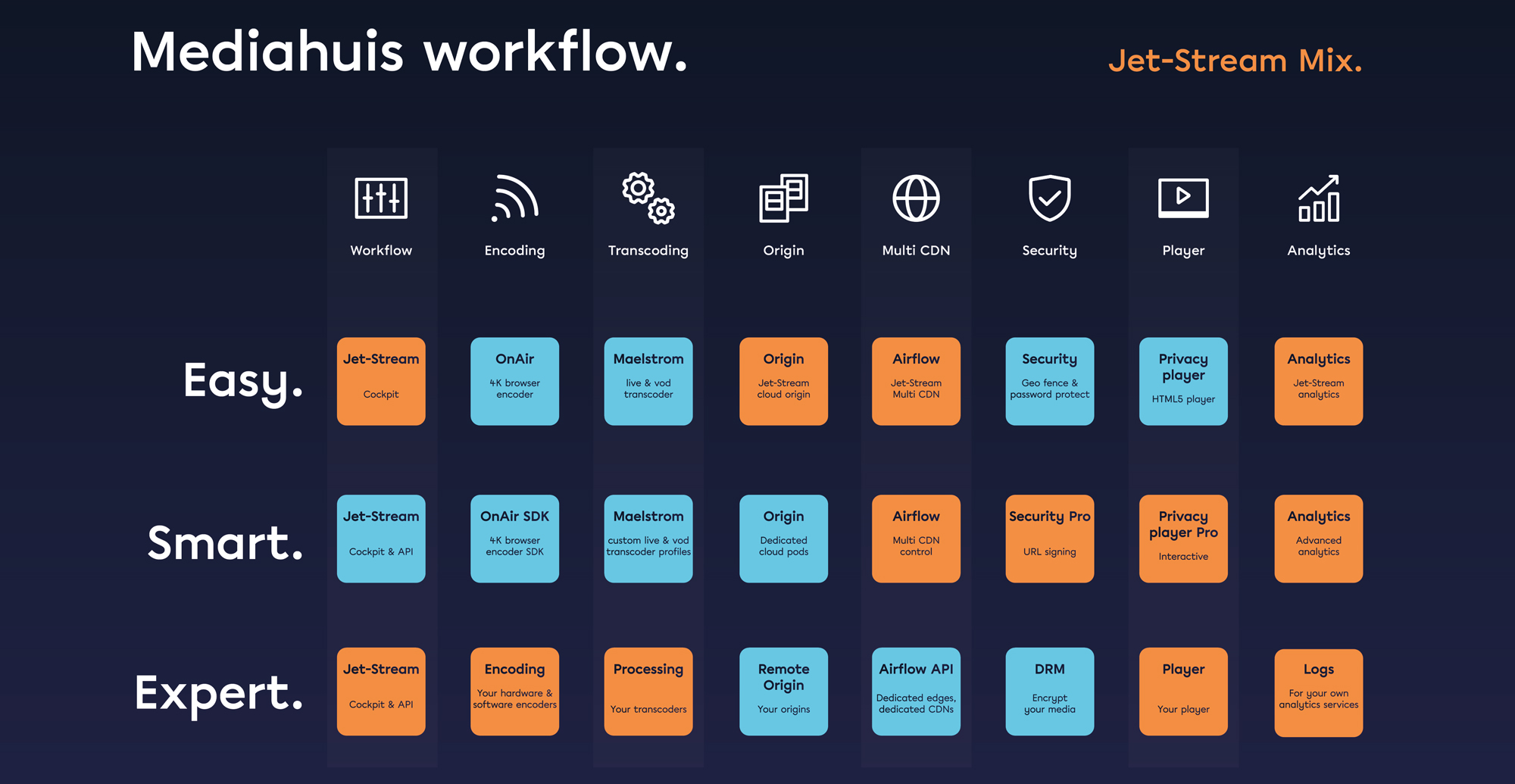 Mediahuis offers on-demand videos and live television streams of events to its audiences. Jet-Stream provides high availability streaming services to guarantee high uptime, high performance and scale. Mediahuis uses the Jet-Stream Mix service to cherry pick Jet-Stream services, tune these to fit their needs, and integrate live encoding, batch ingress, back-end systems, and portals.