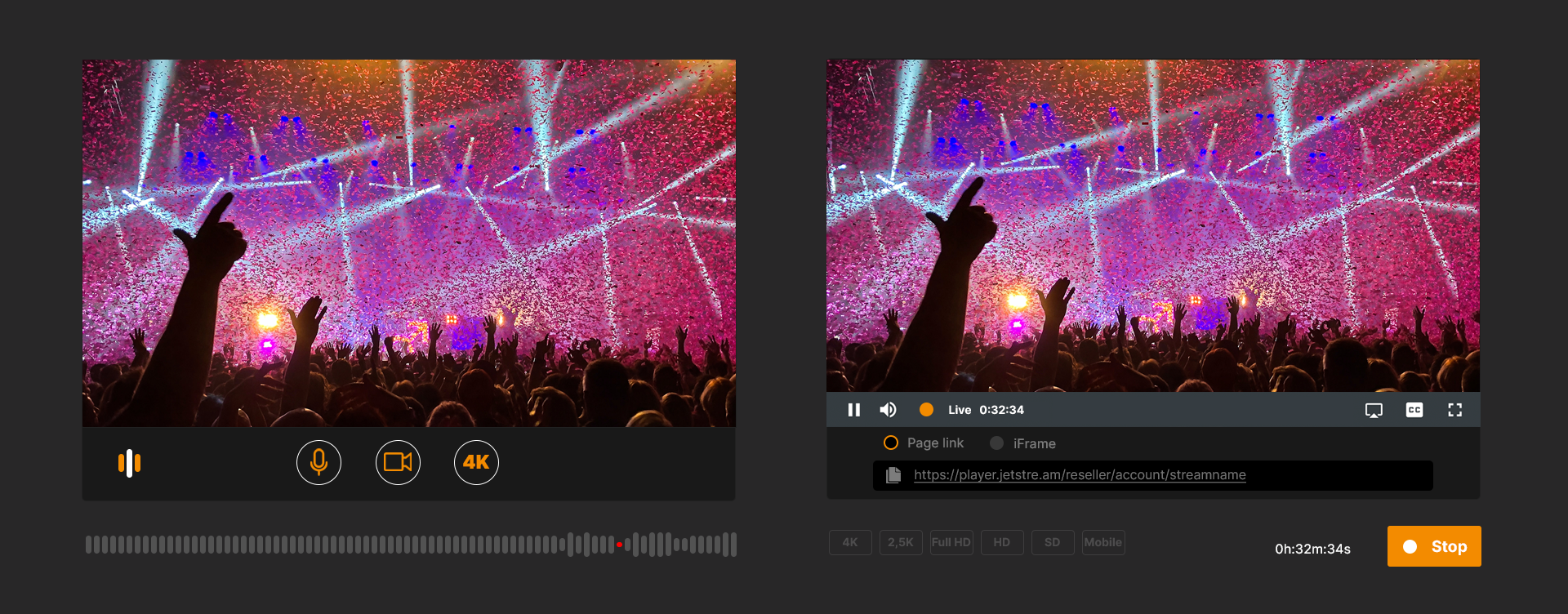 OnAir 4K is the easiest way to stream live at 4K quality. Set up professional live streaming in just one click with zero-install and zero configs. Thanks to OnAir 4K you can stream live straight from your browser.